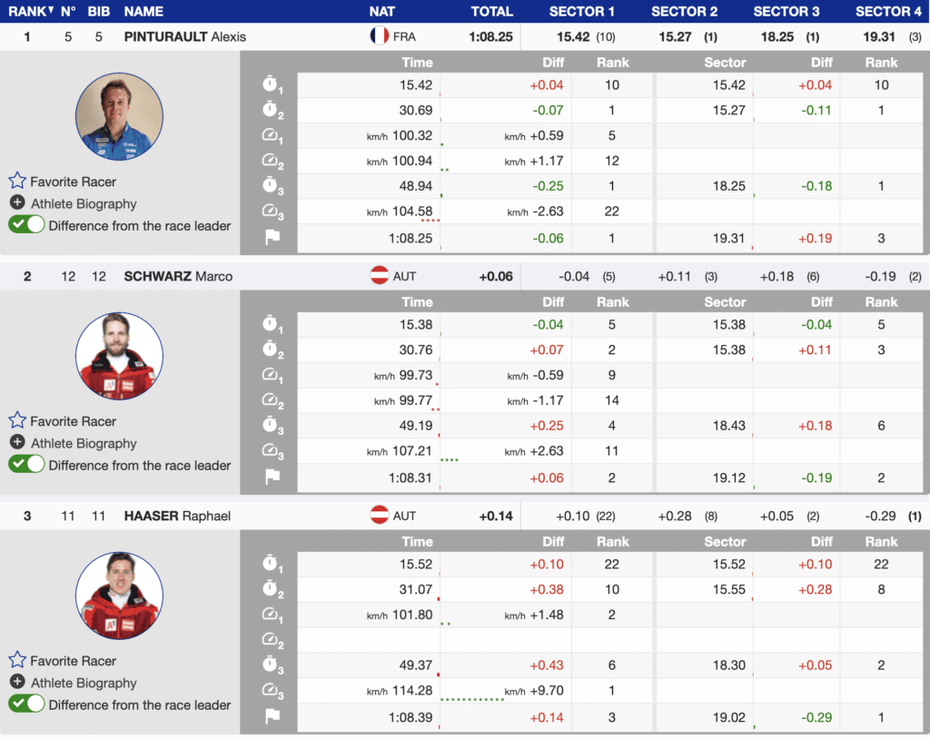 The next of the prerace favorites to ski was Austrian Marco Schwarz. Schwarz crossed only (+0.06) behind the French leader. Both men are capable of great slalom and it is clear they are the two most likely to stand on the top step of the alpine combined podium at the end of the race.