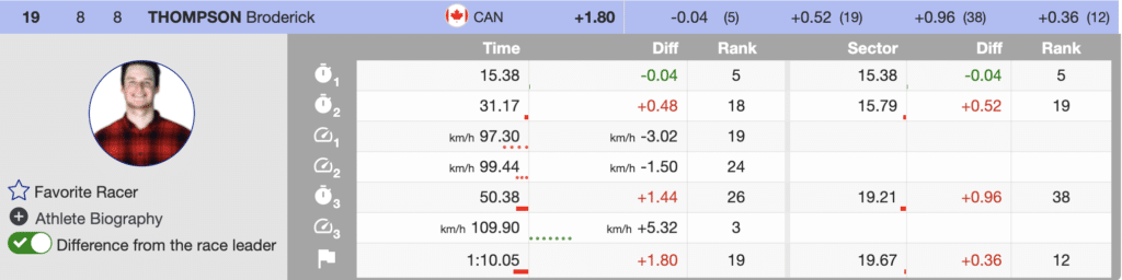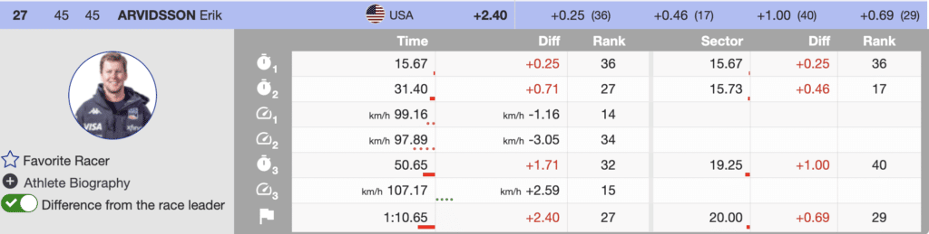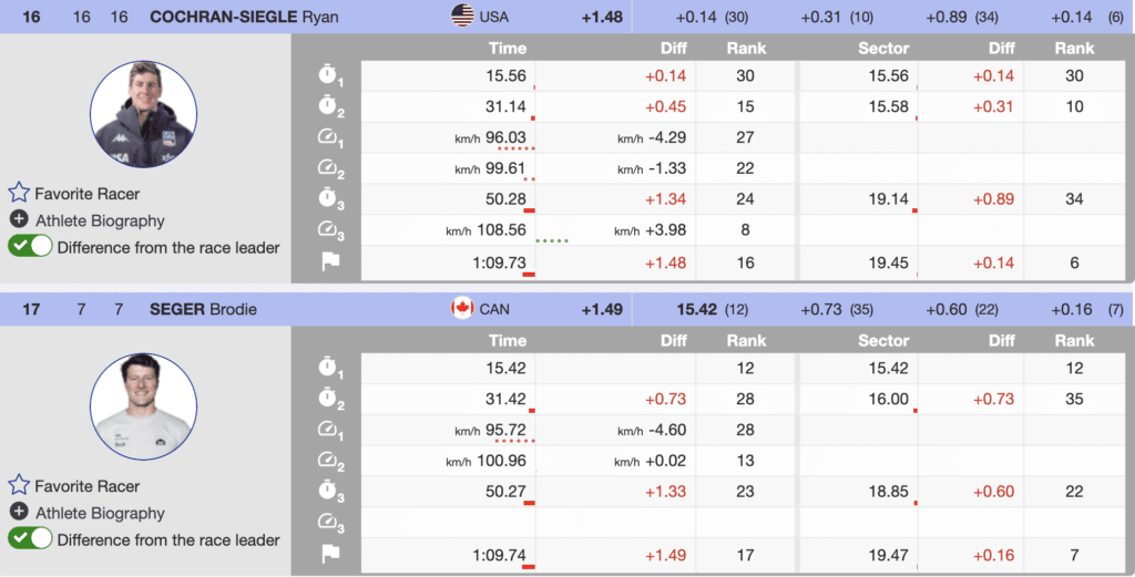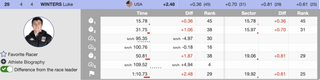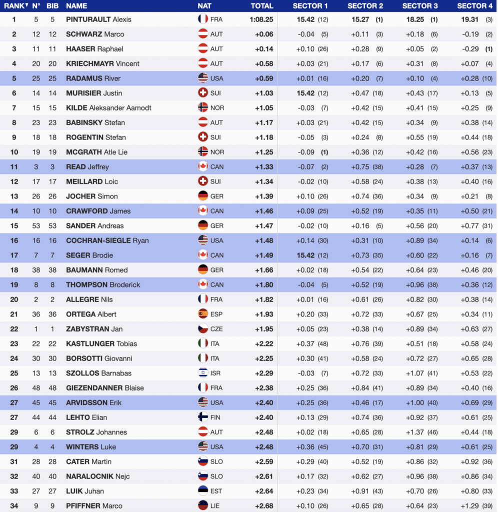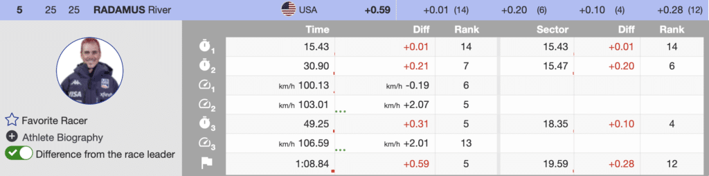 After the super-G, the best-ranked North American is USA’s River Radamus. Radamus clearly liked the snow and it showed with confidence. He is ranked fifth and only (+0.59) behind Pinturault. Radamus doesn’t race slalom but is very capable of skiing the discipline well. He becomes an outside contender for the podium.