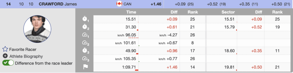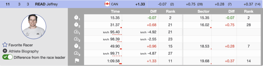 Norway’s prerace contender Atle Lie McGrath skied at a high level but found himself (+1.25) slower than the fastest contender. But because of his excellent slalom ability, he remains a potential medal winner.
