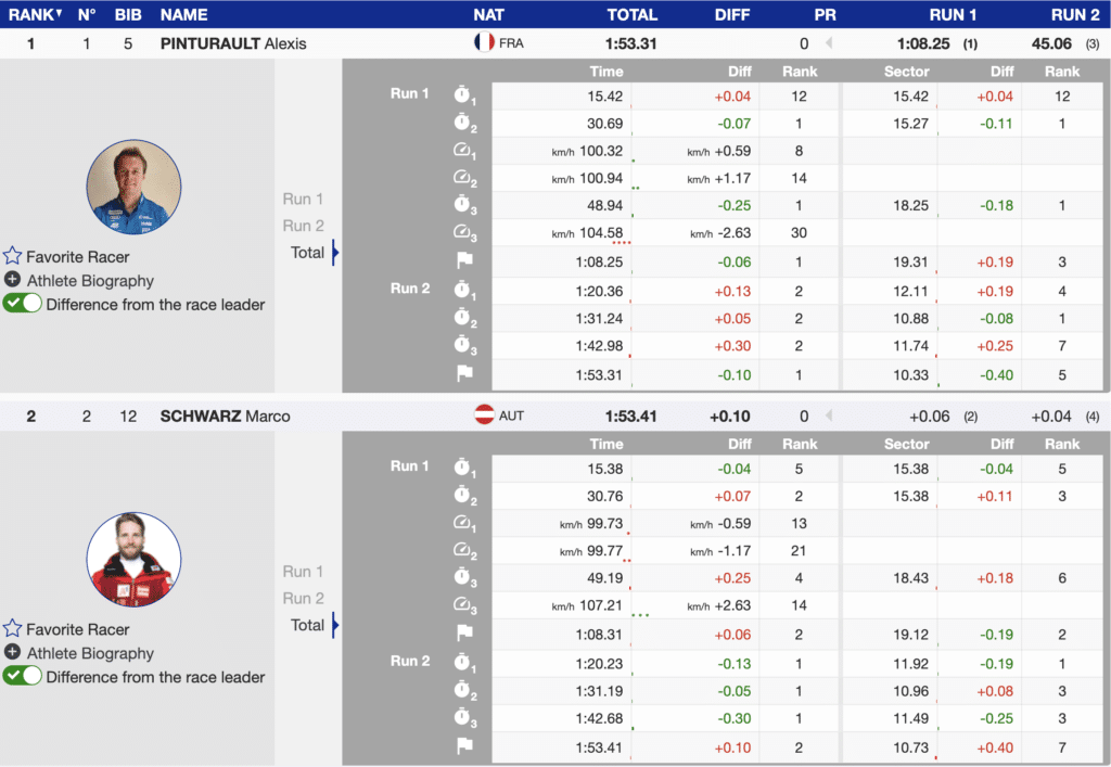 Pinturault’s primary competition going into the final run was Austrian Marco Schwarz. Schwarz started the slalom with a (+0.06) deficit and looked to have taken the lead with only the last tricky gates to ski. However, Schwarz struggled and ended the day second (+0.10).