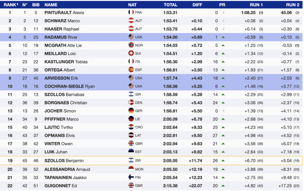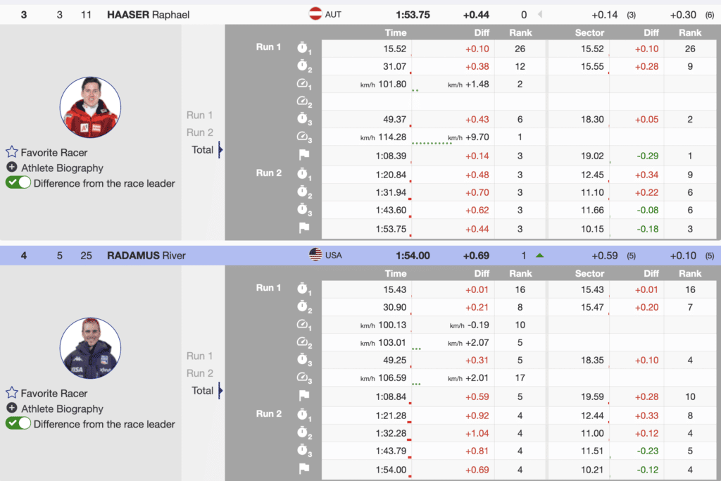 Skiing well in both disciplines, USA’s River Radamus earned fourth place. Radamus was able to make up time on the winner in the slalom, but missed the podium by (+0.25).
