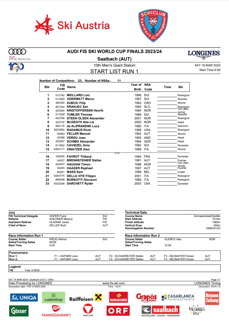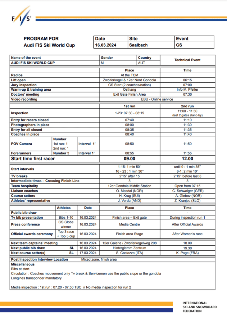 First run men’s start list and daily program for Saturday, March 16th Saalbach World Cup giant slalom finals