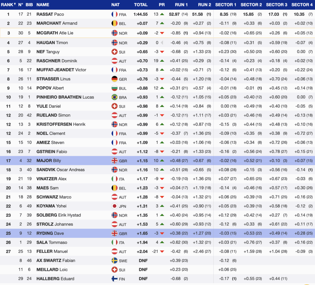 Great Britain’s Billy Major surged into first, earning a full finish-area birthday serenade on his 29th. Norway’s Oscar Andreas Sandvik, Bulgaria’s Albert Popov, and Austria’s Dominik Raschner each took turns on top. Sweden’s Fabian Axel Swartz recorded the first DNF. Veteran Dave Ryding skied smoothly but slotted only into temporary seventh.