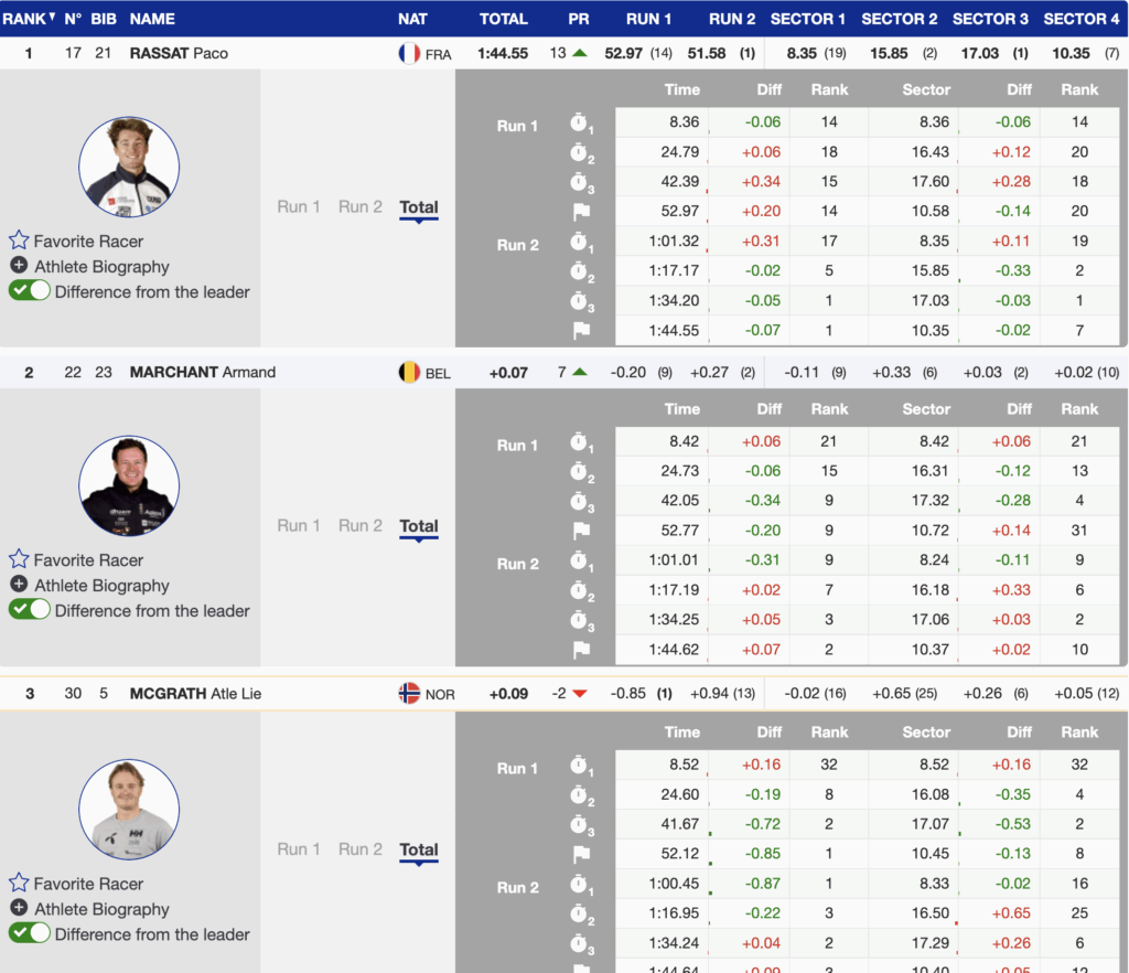 Finland’s Eduard Hallberg, starting with a .68 advantage over Rassat, looked primed to challenge for the win — until he skied out in the final sector. The crowd gasped. The podium picture changed again: