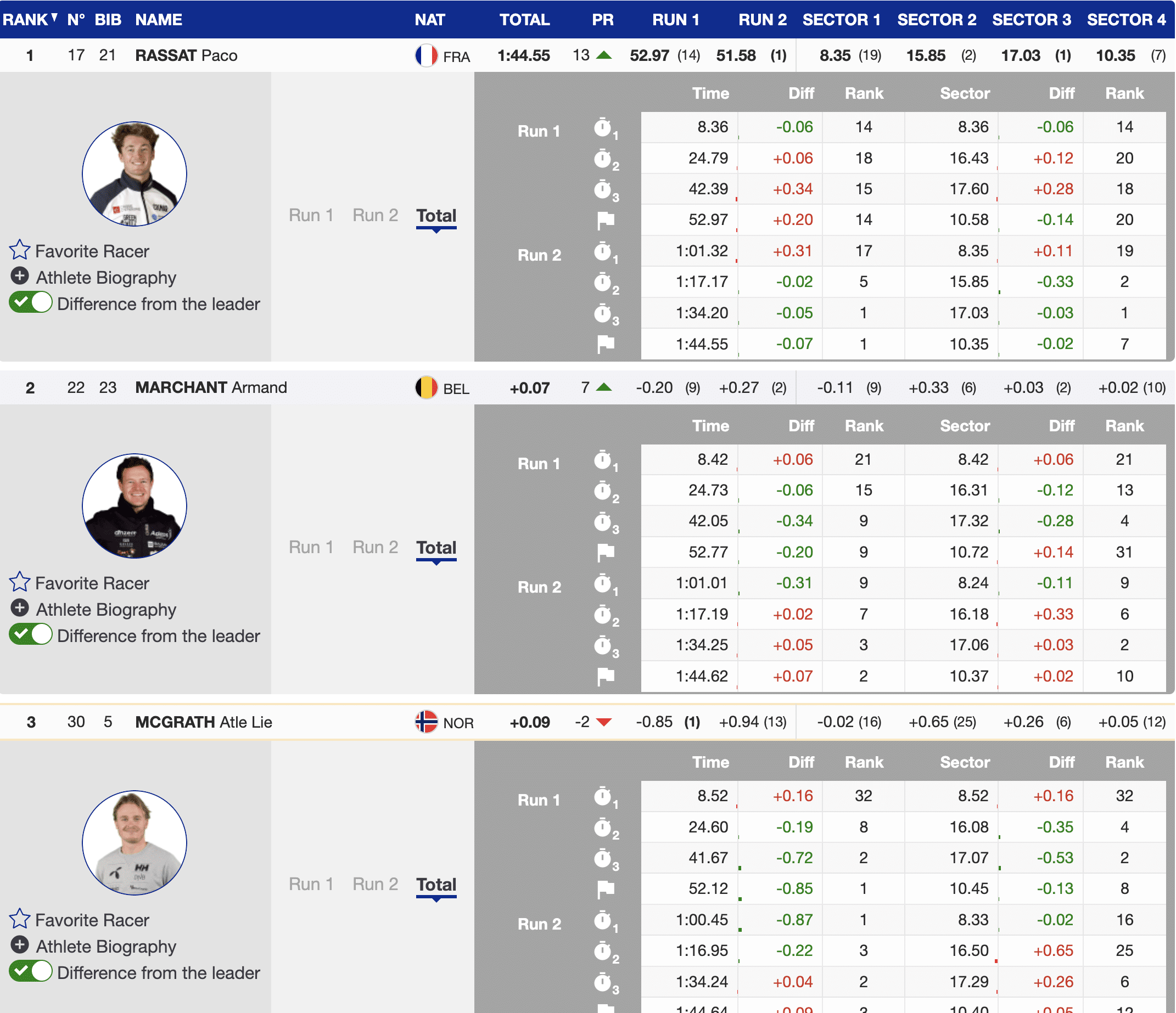 Norway’s Atle Lie McGrath, starting from bib 5, completed the podium .09 off the winning time despite a committed final run. The top three were separated by less than a tenth of a second in one of the most dramatic finishes of the early season.