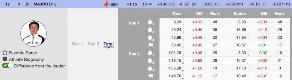 Billy Major climbed ten places and finished 17th — celebrating his 29th birthday with one of the best performances of his career. His early leadership and clean second run held strong against a field packed with talent.