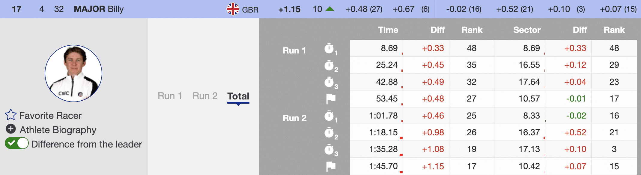 - Billy Major (GBR): +10 places, finishes 17th