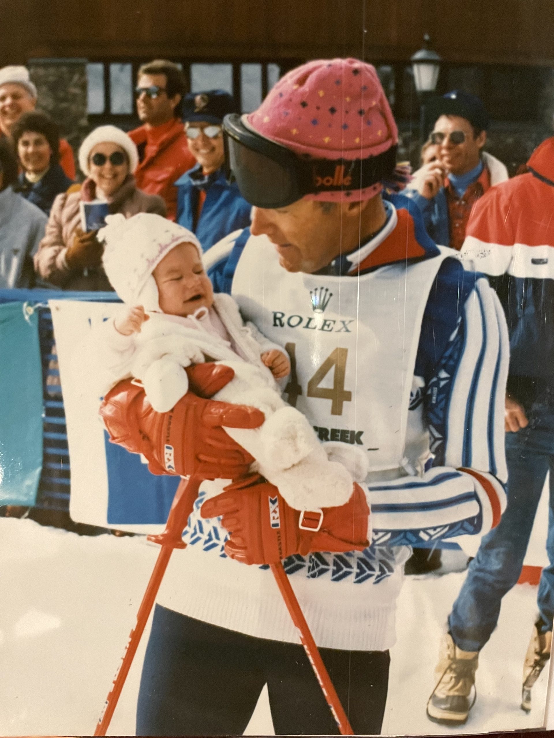 Resi Stiegler recently found photos of her father, triple Olympic medalist Pepi Stiegler, holding her as a small child in the finish area of what looks to be a World Pro Ski Tour race in the 1980s. This week, Resi and her husband will find themselves in a similar situation.