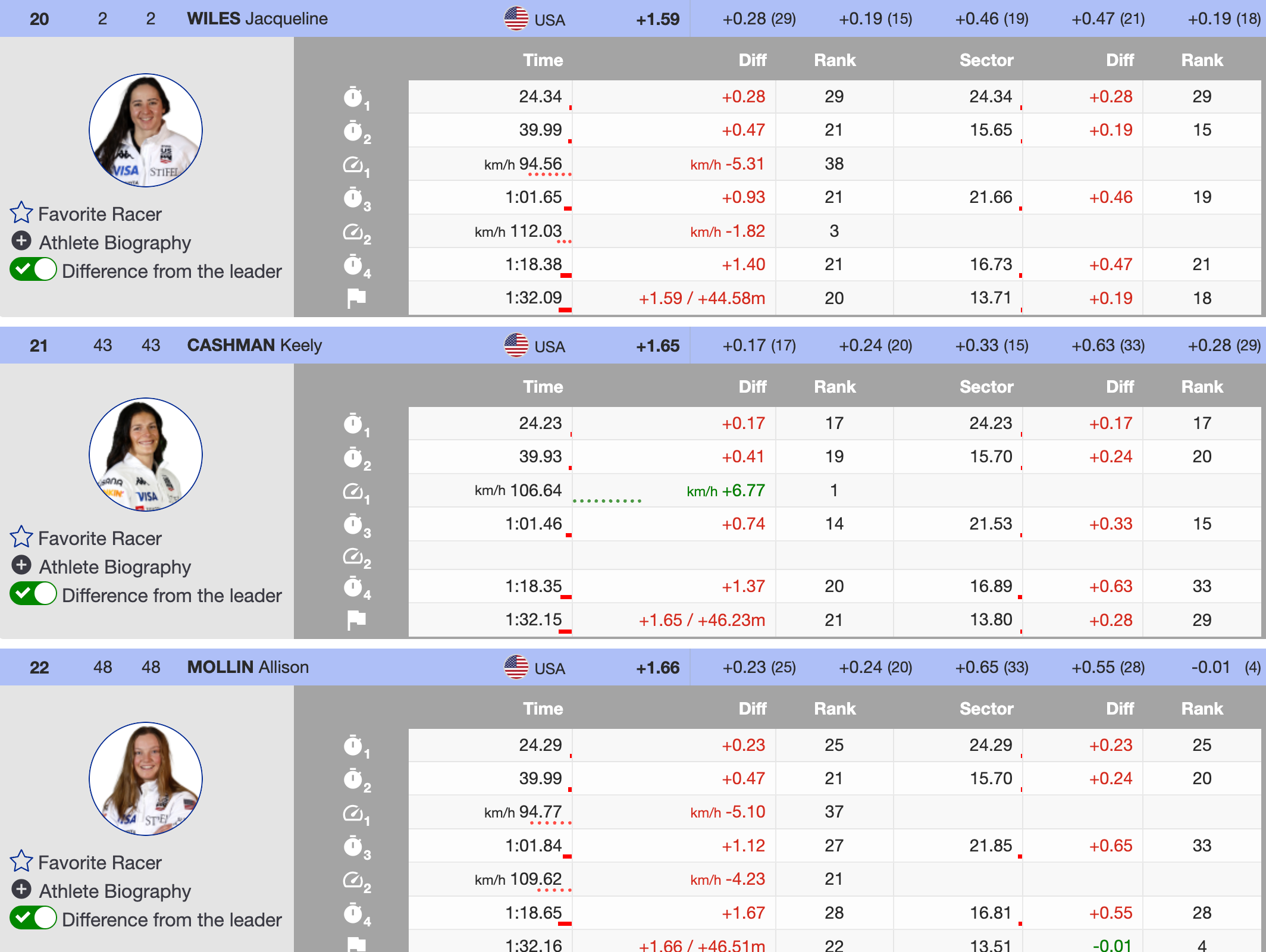 Bib 45 Joana Haehlen (AUT): 26th +1.78- made an impressive comeback today after being yellow-flagged yesterday due to a crash, charging hard today and getting herself into the top 30.