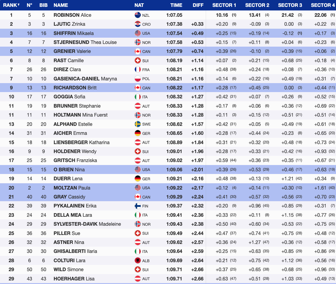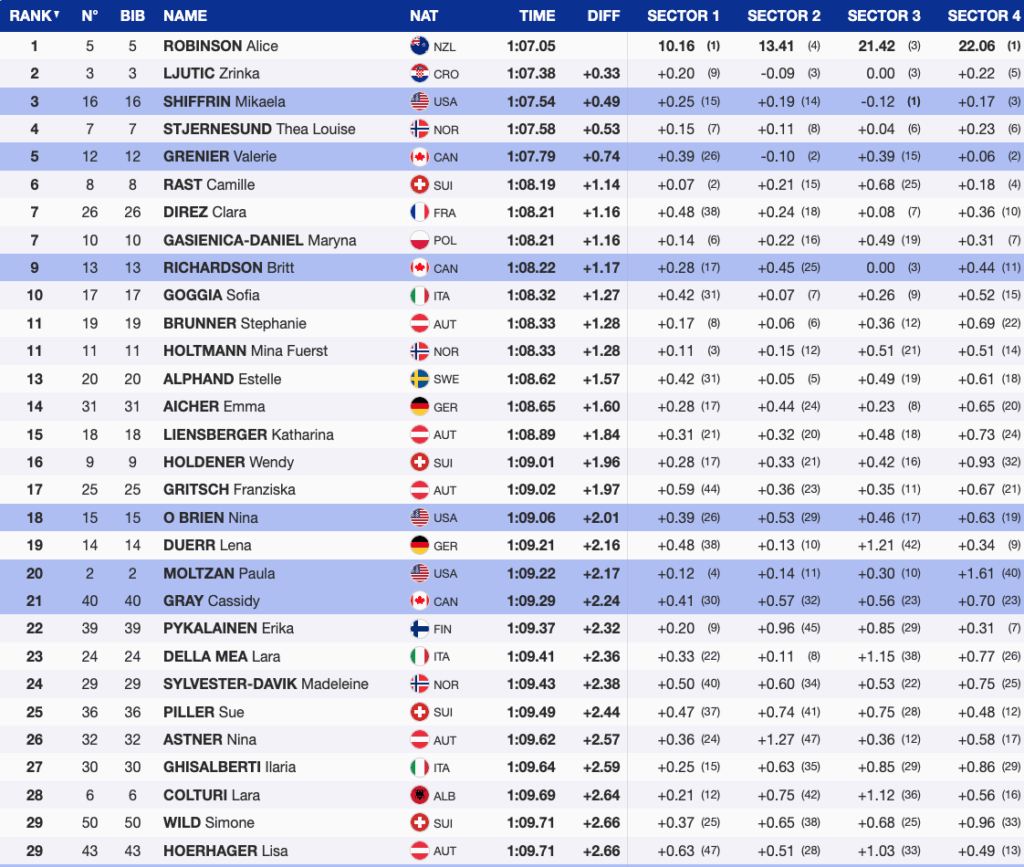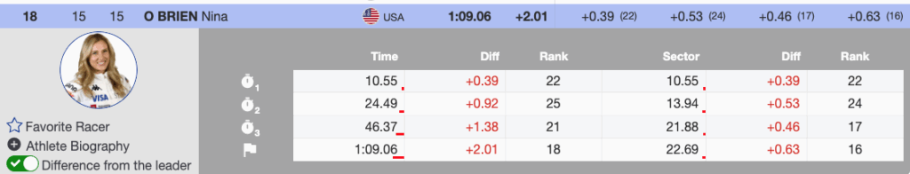 - Nina O’Brien: 18th (+2.01), powerful skiing despite soft-snow challenges.