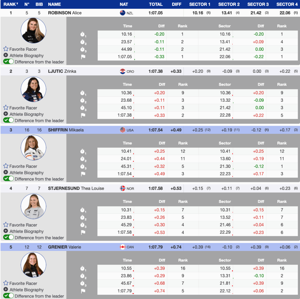Croatia’s Zrinka Ljutic, skiing a course set by her father, produced one of the most complete runs of her season. She stayed composed through the blind rolls, carried speed cleanly across the mild terrain, and reached the finish 0.33 behind Robinson. It was another step forward in her growing GS consistency.