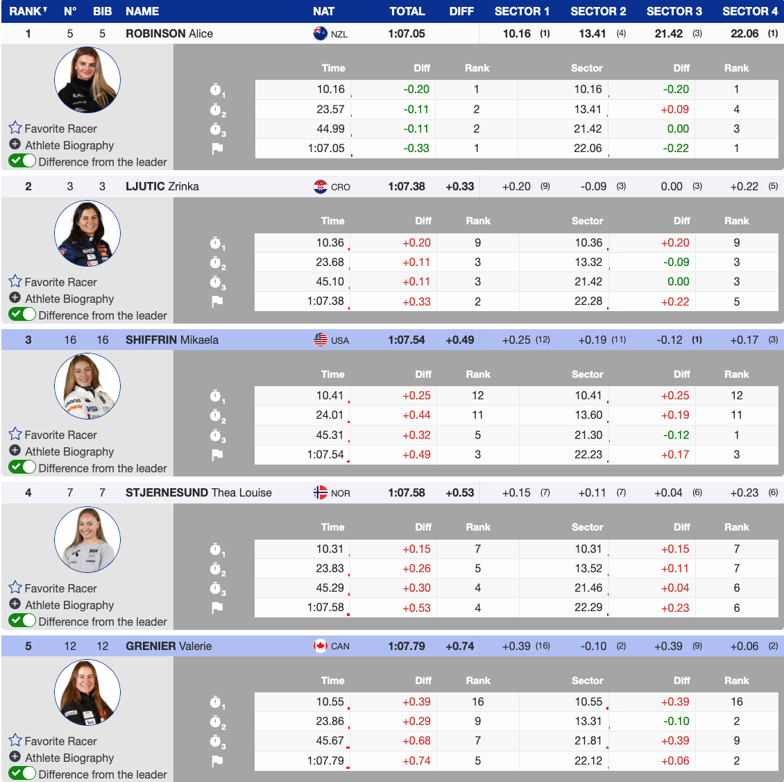 France’s Clara Direz (bib 26) delivered one of the morning’s best moves with a sharp, well-timed run into 7th (+1.16). Camille Rast and Maryna Gasienica-Daniel also remained close, sitting in a tight group inside 1.2 seconds of the lead.