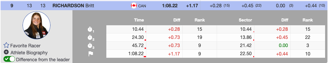 - Britt Richardson: fearless skiing and top-10 pace, landing 9th (+1.17).