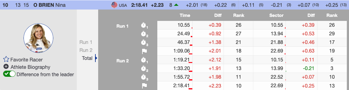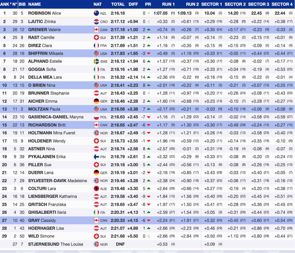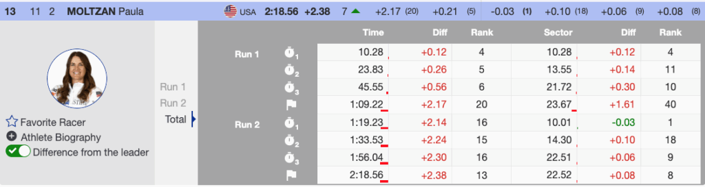 - Paula Moltzan (USA) charged 7 spots to finish 13th, recovering from a mistake-heavy first run with fast, attacking skiing.
