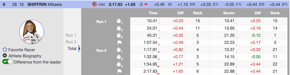 “I felt very aggressive on the second run. The visibility was so dark it felt like skiing at night without any lights… I cleaned up the top pitch, but I mistimed a few things on the flats and you lose speed so fast when it’s that flat. All in all the day was super positive.” — Mikaela Shiffrin