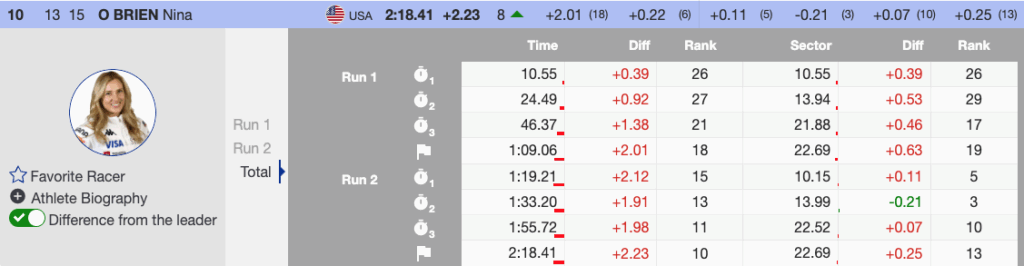 - Nina O’Brien — 10th, +8 with confident, balanced skiing