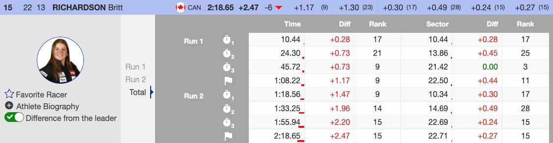 - Britt Richardson — 15th, strong skiing with room to grow on the second run