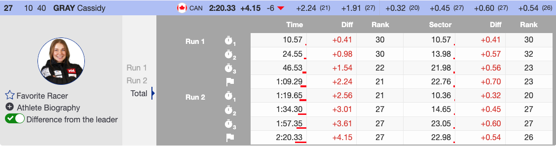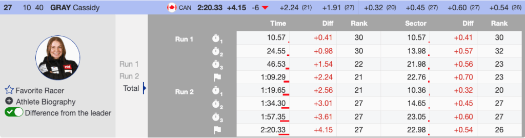 - Cassidy Gray — 27th, skiing aggressively but punished by mistakes she openly acknowledged