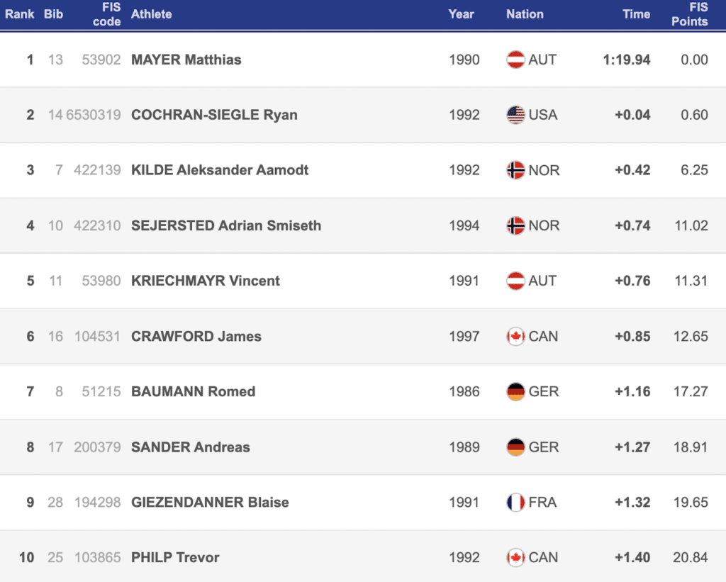 After his stutter at the start, Mayer was only sixth-fastest through the first checkpoint on The Rock course. But he mastered the narrow and technical layout the rest of the way down and finished a mere 0.04 seconds ahead of the next starter, first-time medalist Ryan Cochran-Siegle of the United States.