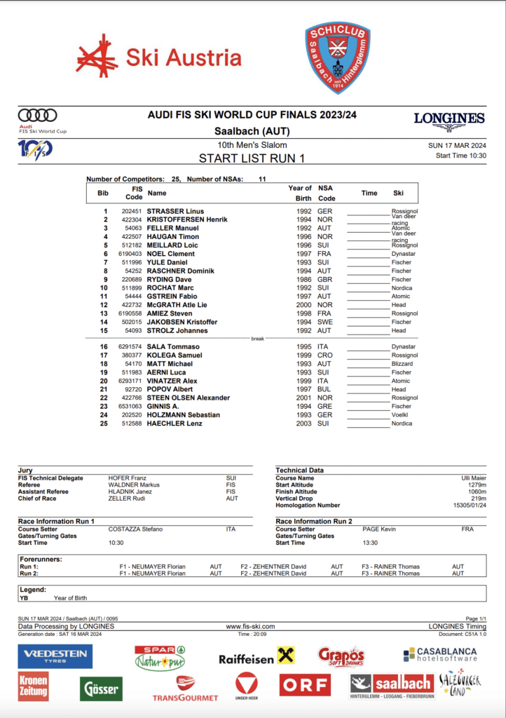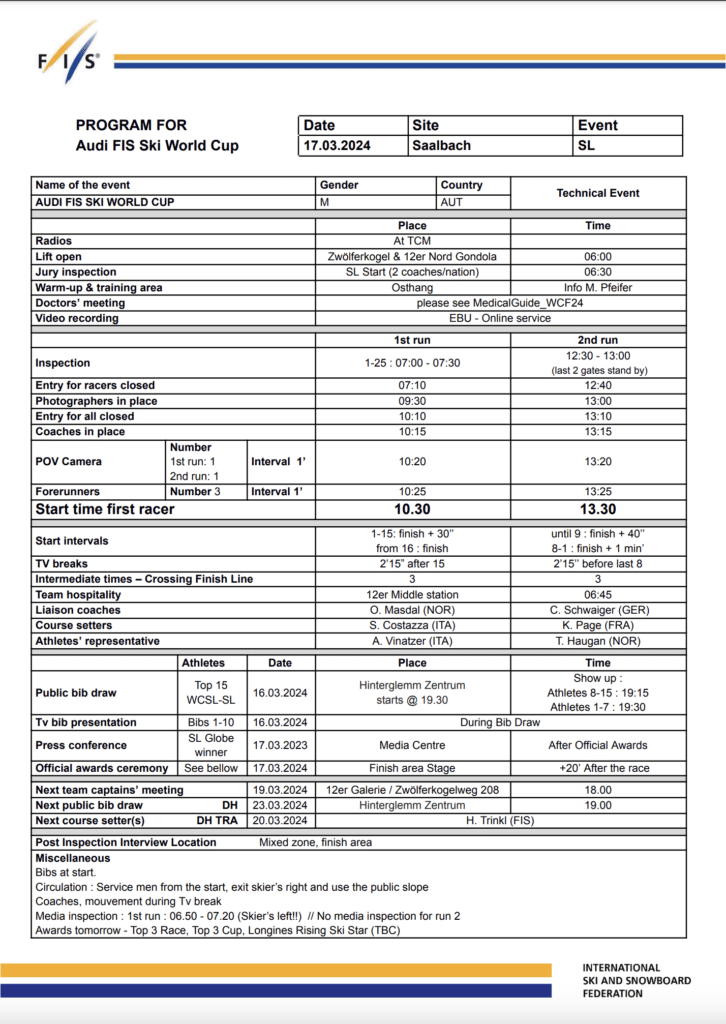 First run start list and the daily program for the Sunday, March 17th Saalbach World Cup Finals slalom