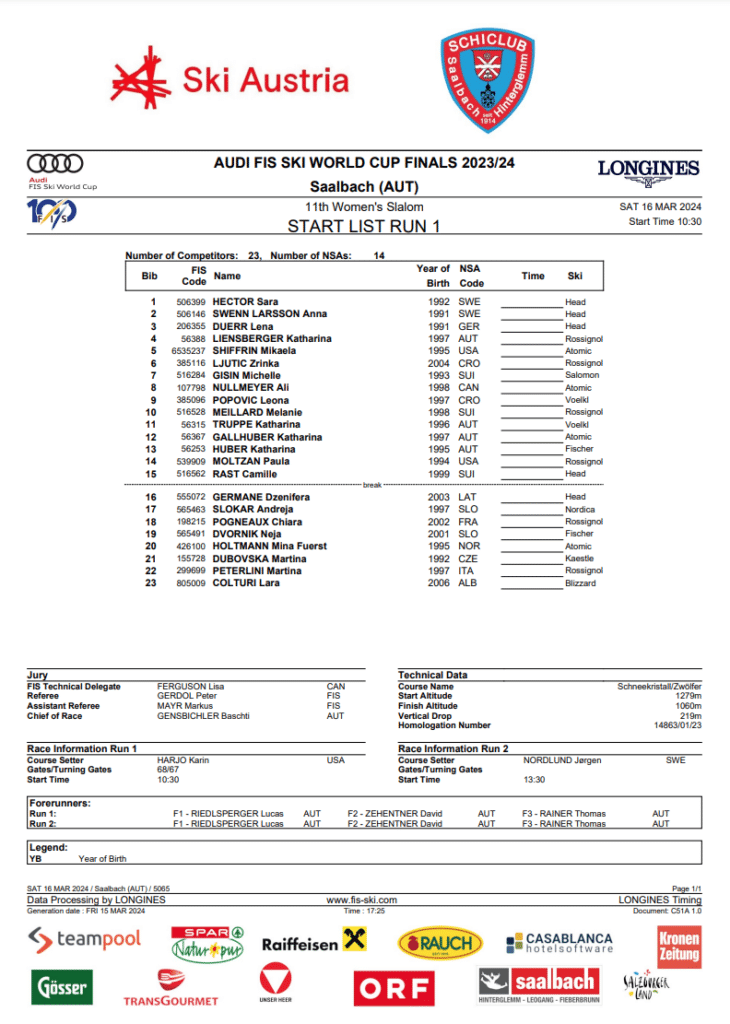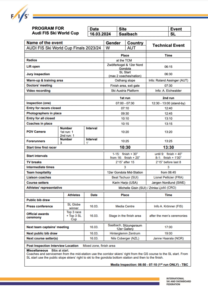 First run start list and daily program for Saturday, March 16th Saalbach World Cup slalom final