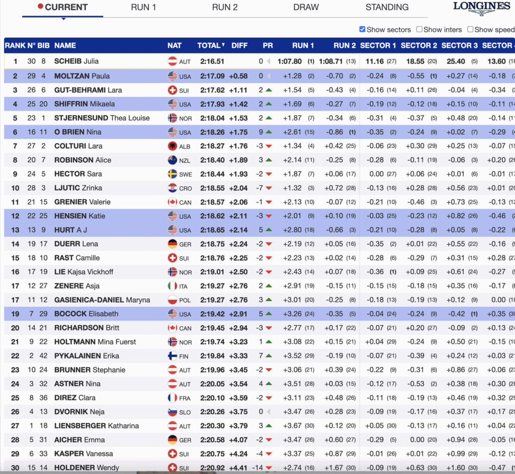 The Americans dominated the second run, placing three racers in the top six overall — Moltzan second, Shiffrin fourth, and O’Brien sixth — and all five starters inside the top 20.