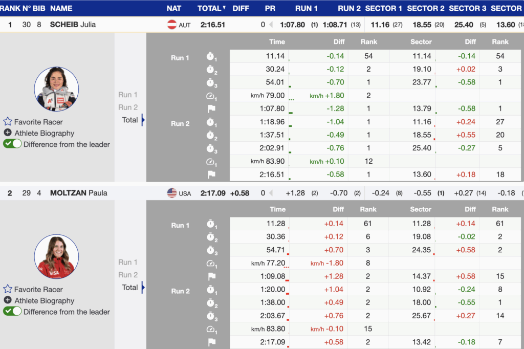 Just before Scheib’s winning run, Paula Moltzan delivered one of her best performances in giant slalom. Her clean, powerful skiing through the steep middle section gave her a 0.53-second lead over Gut-Behrami and secured her second career World Cup GS podium, improving on her third-place result last season.