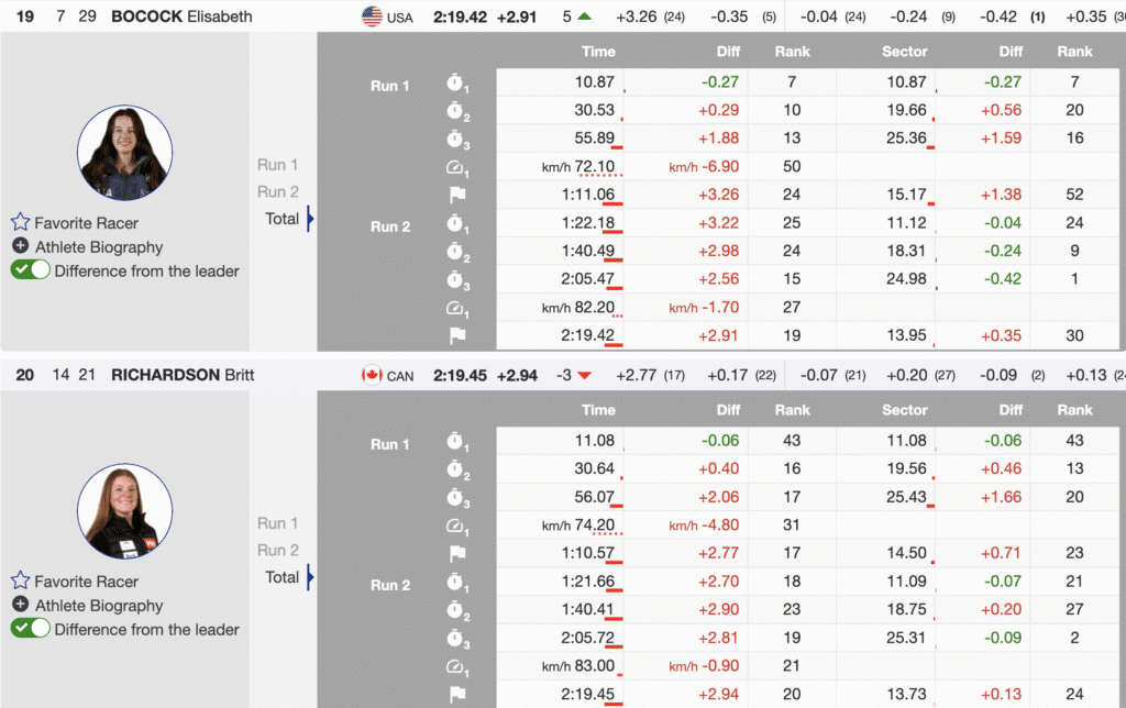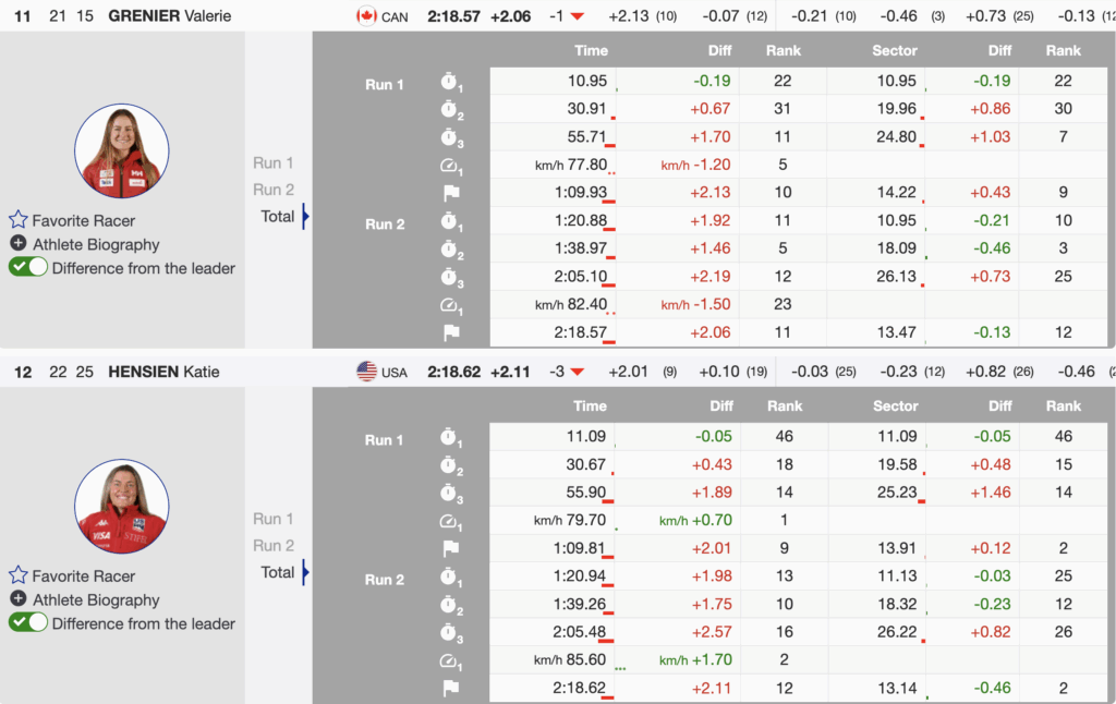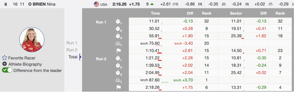 - Nina O’Brien (USA) — gained nine places (15th → 6th), fastest second run.