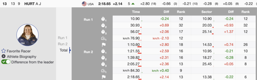 Soon after, AJ Hurt blasted into first with aggressive, fearless skiing. She would later finish 13th overall, moving up five places thanks to the third-fastest second run.