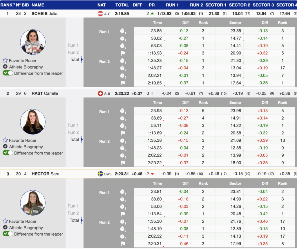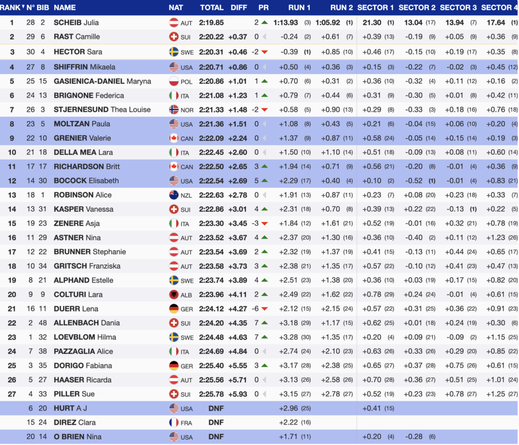 Shiffrin, fourth-fastest from the first run, increased her advantage through the top of the second run and crossed the line in the lead. However, the final three starters — Scheib, Rast, and Hector — all skied faster, pushing her to fourth. The result matched her strongest giant slalom finishes since returning from injury and reaffirmed her return to podium-level contention.