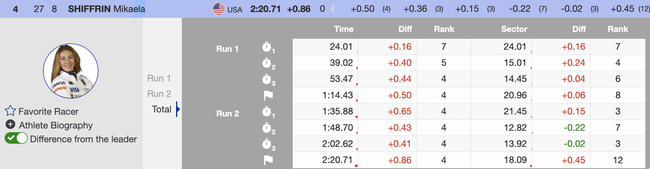 - 4th — 🇺🇸 Mikaela Shiffrin (USA) — YOB 1995 — +0.86 — Atomic, Oakley