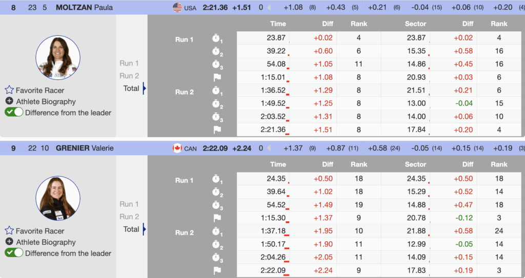 “I’m happy to find the finish line two more times in a row, which is nice,” Moltzan said. “I’m a little bummed with how I skied the first run, but in the end, another top 10 feels great for me and keeps building on my consistency.”