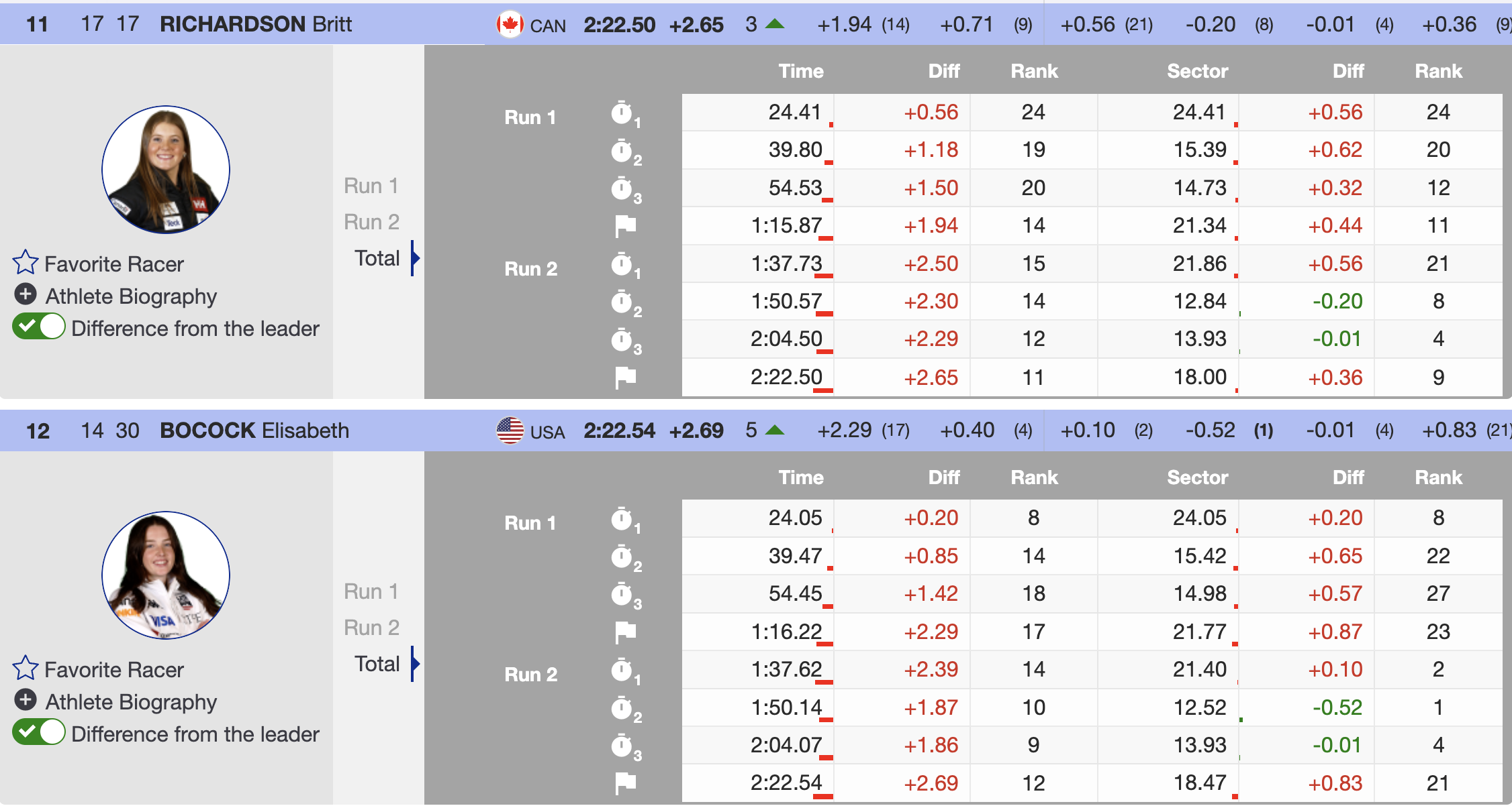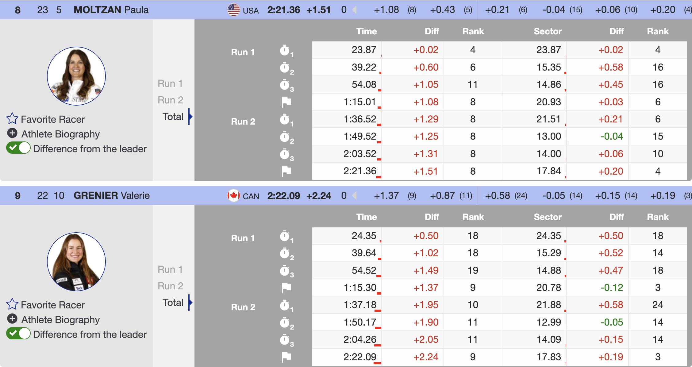 Grenier briefly seized the lead during the second run in her first race back from injury and finished inside the top 10, an encouraging sign as she rebuilds momentum in the Olympic season. Richardson followed with another composed run to finish just outside the top 10.