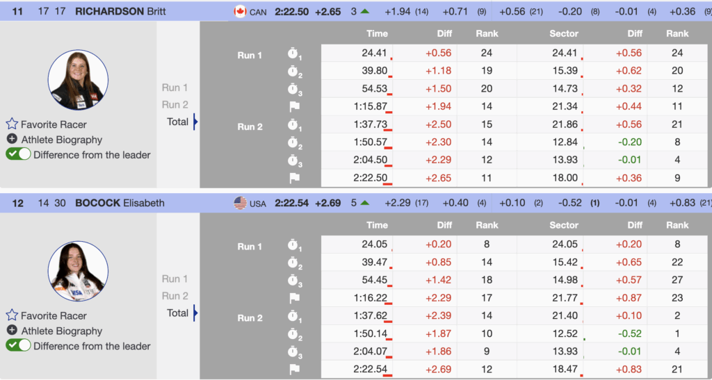 Bocock delivered the fourth-fastest second run, gaining five positions to finish 12th. The result surpasses her career-best 14th-place finish in Kranjska Gora earlier this season and firmly puts her in the conversation for the Olympic team.
