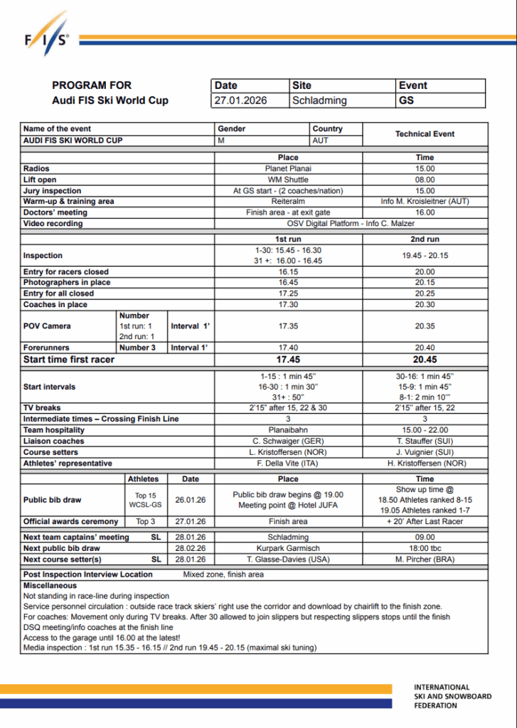Ski Racing offers the full Schladming start list and program, along with details on how and when to watch