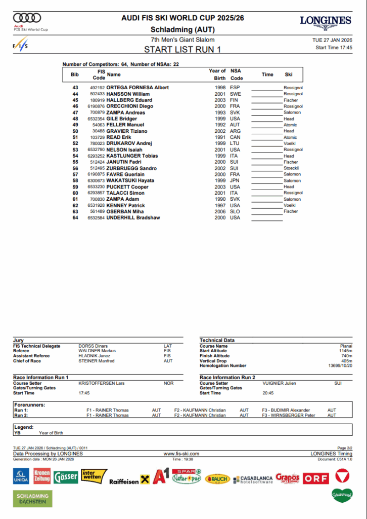 Course setters — First run: Lars Kristoffersen (NOR) Second run: Julien Vuignier (SUI)