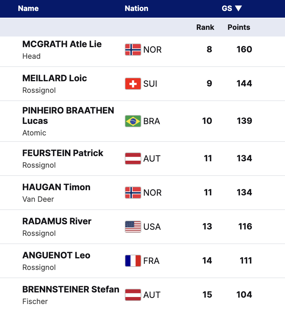 Current Top 15 Men’s 2024-25 GS World Cup Standings