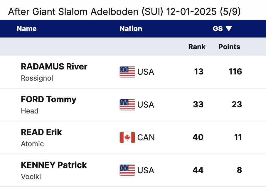 With Tommy Ford sidelined for the season, Radamus shoulders the responsibility of representing U.S. GS skiers at the highest level. Patrick Kenney, an independent athlete with Global Racing, scored his first World Cup points this season by finishing 23rd in Adelboden and is working to build on that result.
