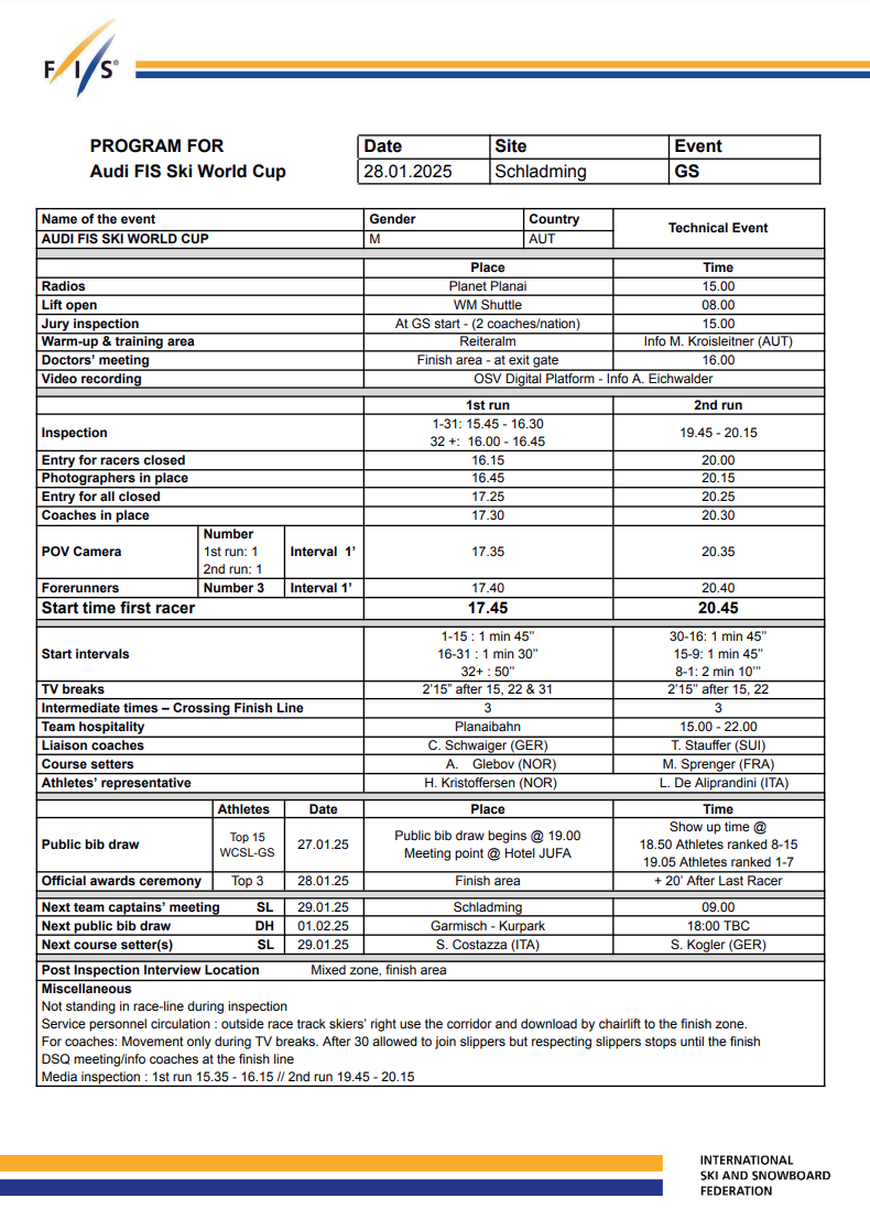 With Schladming as the only GS under the lights, this race provides a unique and critical opportunity for athletes before the season’s biggest stage in the Saalbach World Championships.