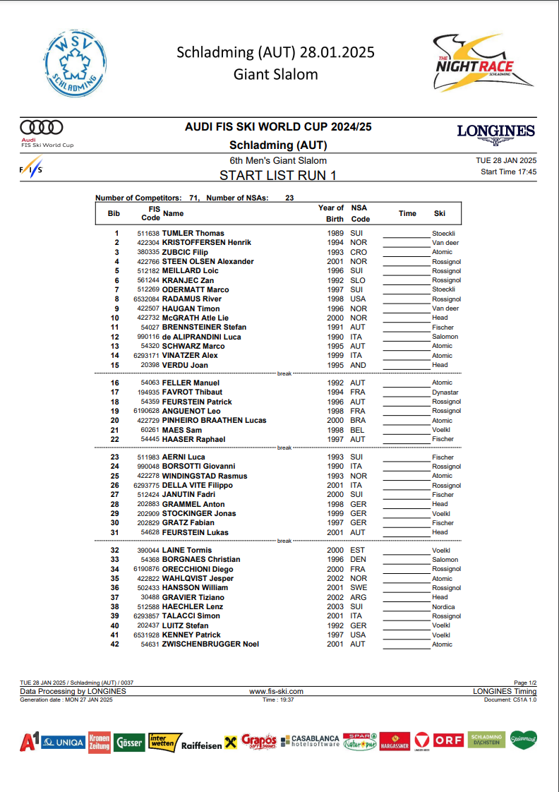 Seventy-one men from 23 countries are set to compete in the Men’s World Cup Giant Slalom in Schladming on Jan. 28.