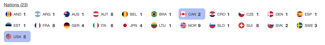 Austria has three representatives (Patrick Feurstein, Stefan Brennsteiner, and Manuel Feller), while Slovenia (Žan Kranjec), Italy (Luca De Aliprandini), and Croatia (Filip Zubčić) maintain strong top-10 positions. Brazil’s Lucas Pinheiro Braathen, France’s Léo Anguenot, and the Stifel U.S. Ski Team’s River Radamus round out the top 15.