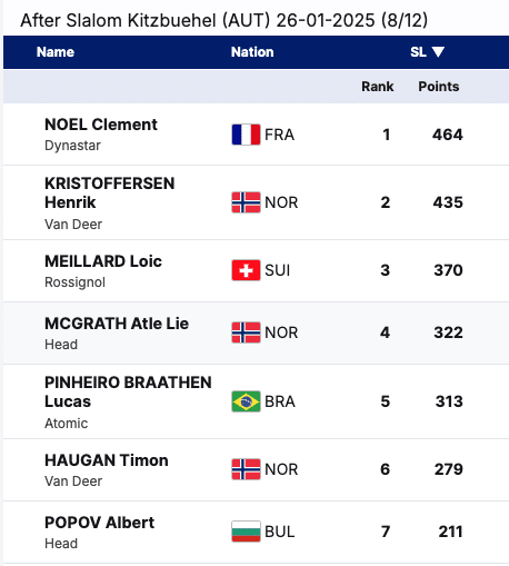 McGrath and Haugan remain competitive, ranking fourth and sixth with 322 and 279 points, respectively. Braathen, sitting fifth with 313 points, continues to challenge the leaders with his strong performances. Strasser and Popov, both in the top 10, add even more depth to the standings. With four World Cup races remaining, including the iconic Schladming Night Slalom, the race for the slalom title remains wide open.