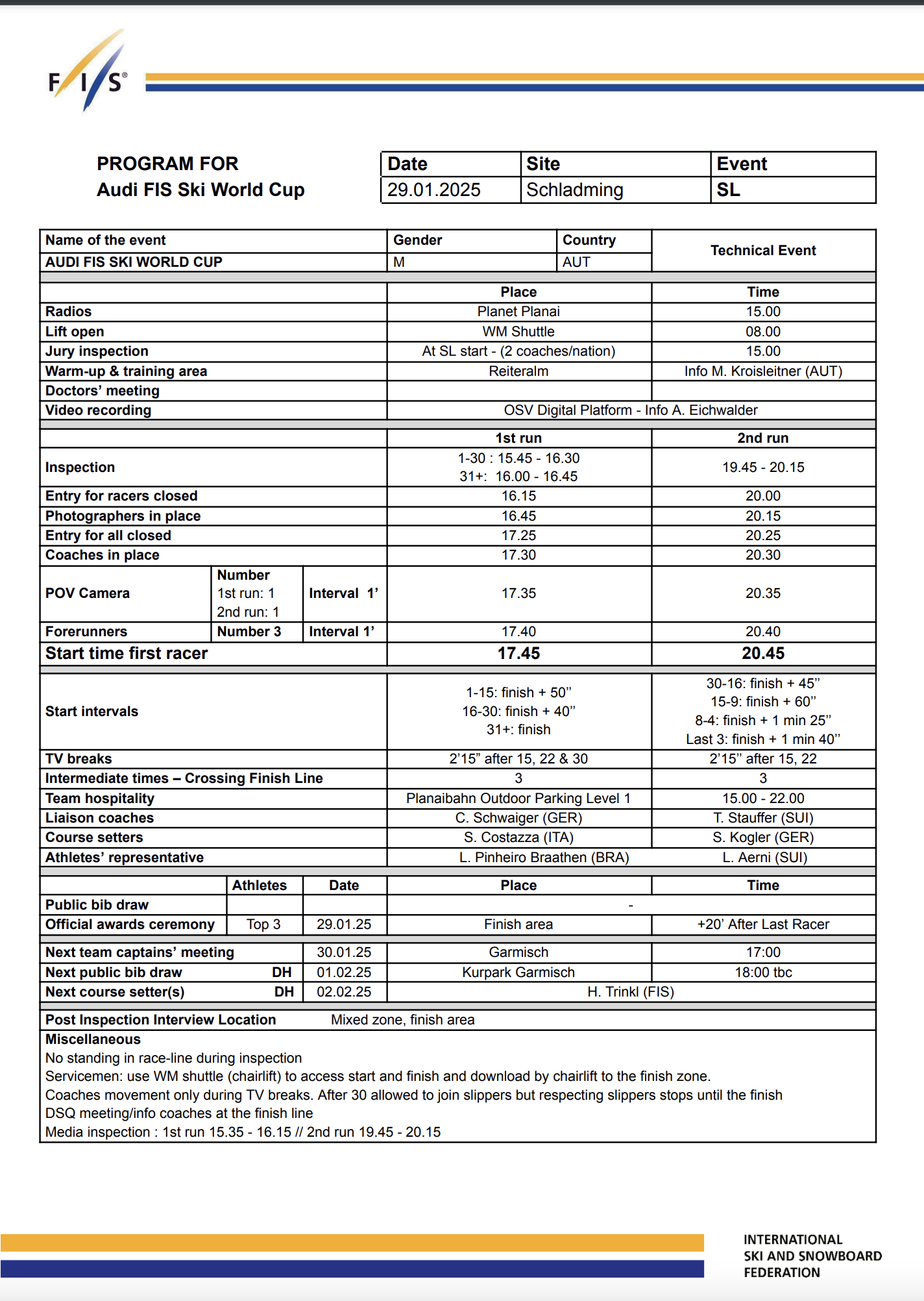 Daily Program and First Run Start List