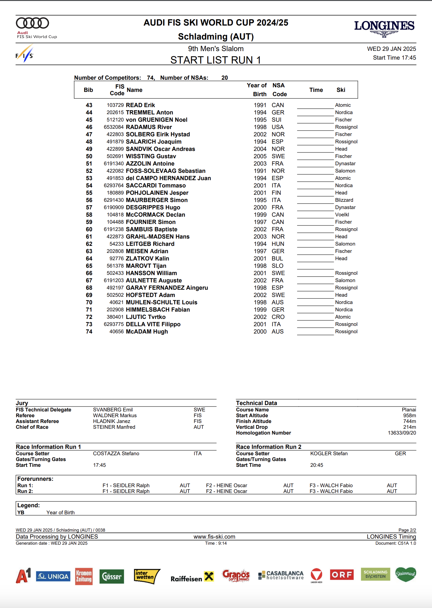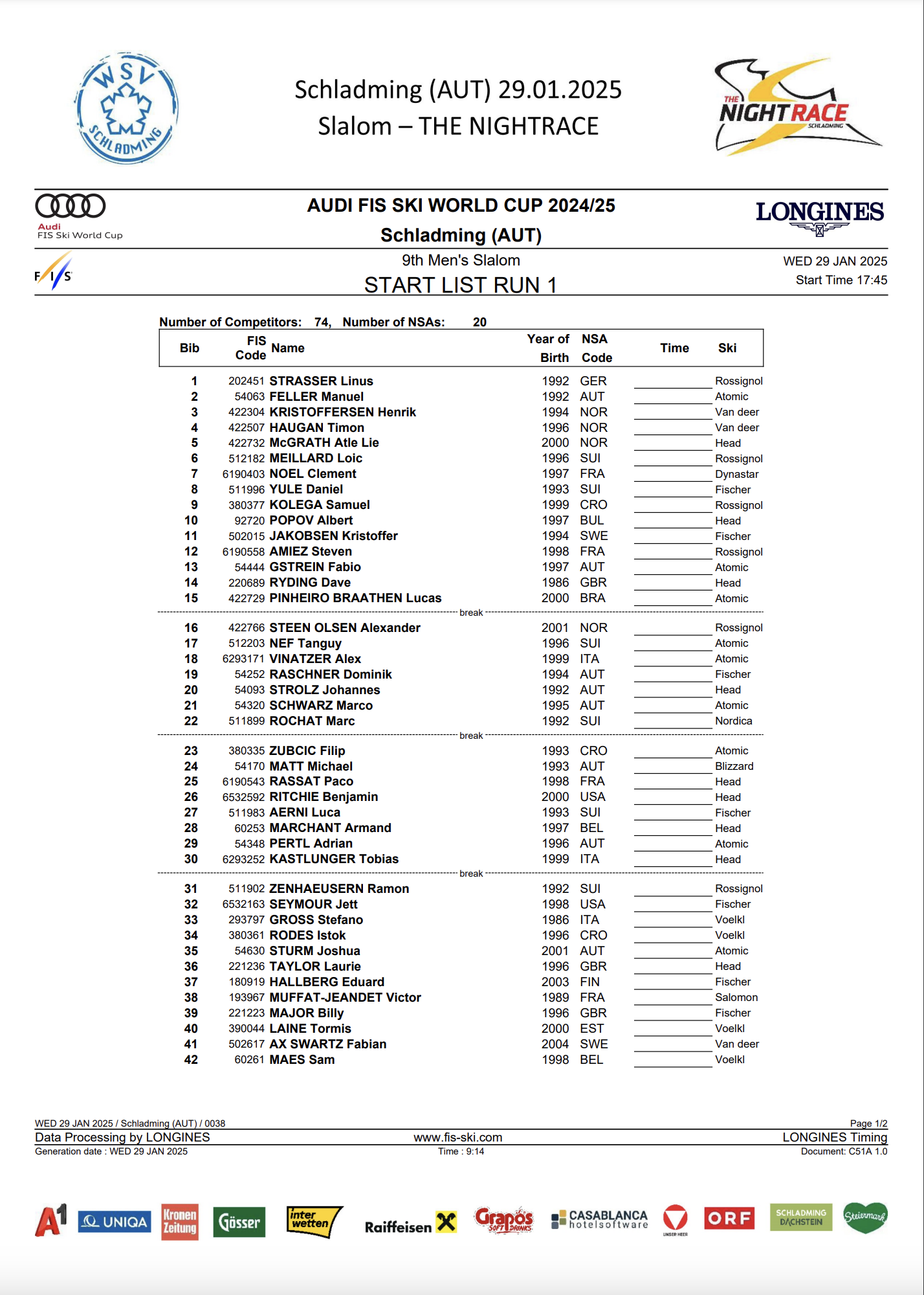 Seventy-four men from 20 nations will compete in the World Cup night slalom in Schladming on Jan. 29.