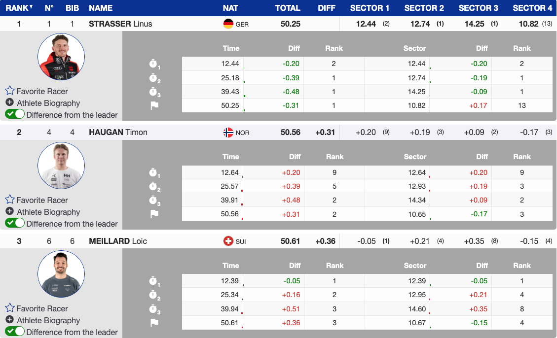 By the time the top seven had completed their runs, Strasser led with a 0.31 advantage over Norway’s Timon Haugan and 0.36 over Switzerland’s Loïc Meillard. The fastest six were separated by just 0.71, while Norway’s Henrik Kristoffersen sat over a second back.