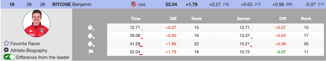 Stifel U.S. Ski Team’s Ben Ritchie extended his streak by qualifying for a fifth consecutive race, marking his seventh qualification this season. His breakout year continues, driven by noticeable improvements in his skiing. With another solid first run, he remains on track in his climb up the standings. Sitting 1.79 seconds behind Strasser in 18th place, he is well-positioned to push for more in the second run. Unfortunately, he was the only North American to qualify.