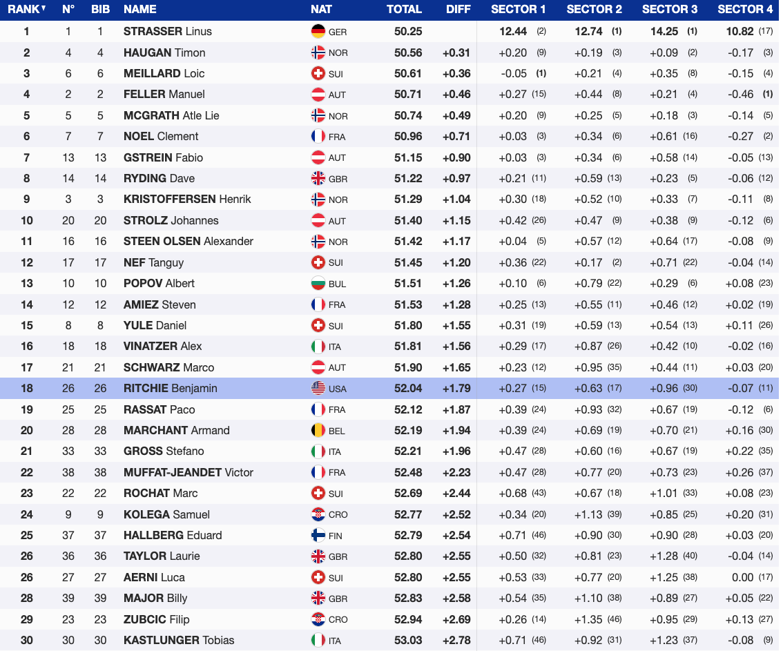 By the time the top seven had completed their runs, Strasser led with a 0.31 advantage over Norway’s Timon Haugan and 0.36 over Switzerland’s Loïc Meillard. The fastest six were separated by just 0.71, while Norway’s Henrik Kristoffersen sat over a second back.