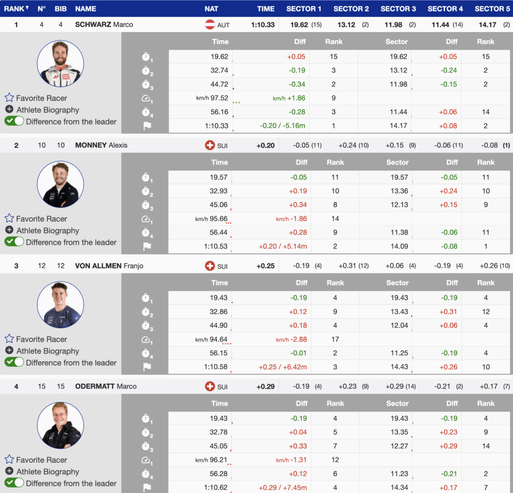 Switzerland flooded the top of the results sheet behind Schwarz, placing three skiers inside the top four and reinforcing its depth in super-G.