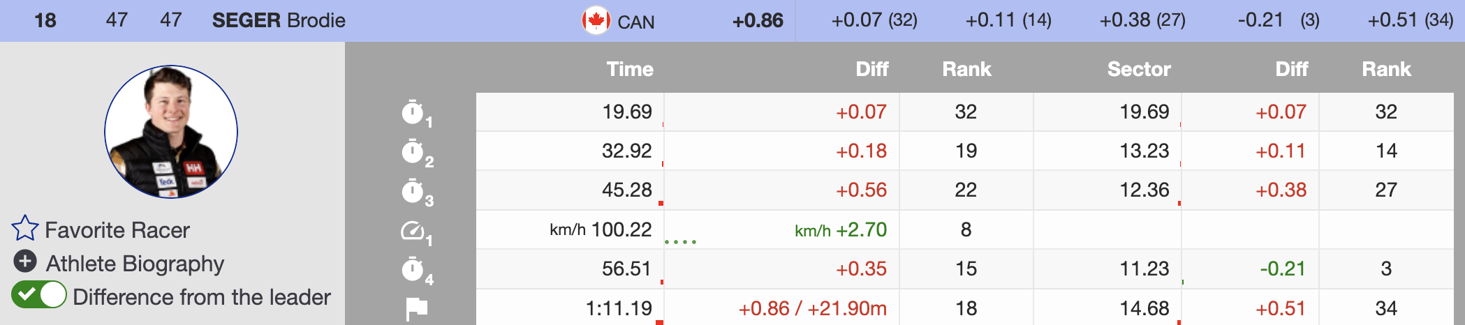 - Bib 47 — 🇨🇦 Brodie Seger (CAN) — 18th, +0.86