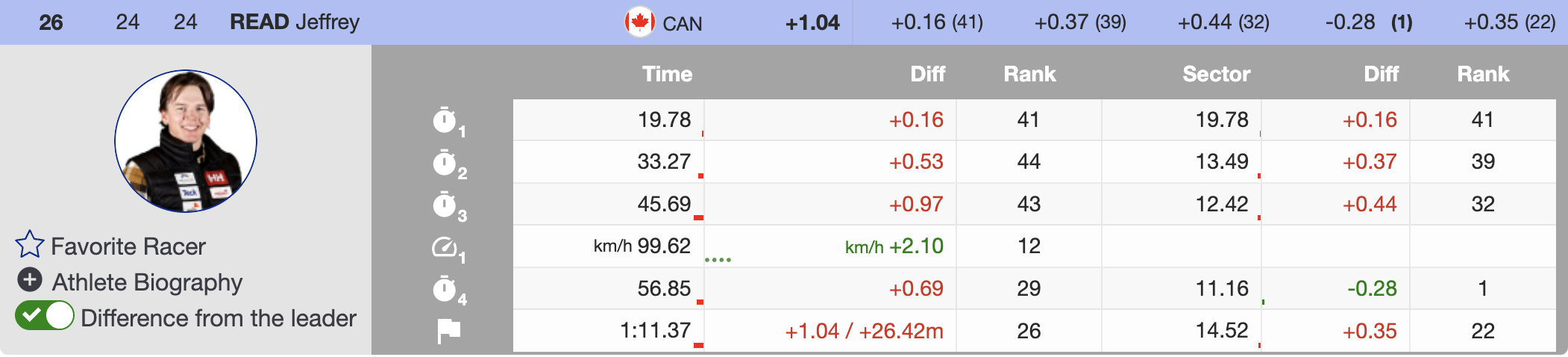 - Bib 36 — 🇨🇦 Riley Seger (CAN) — 23rd, +0.95